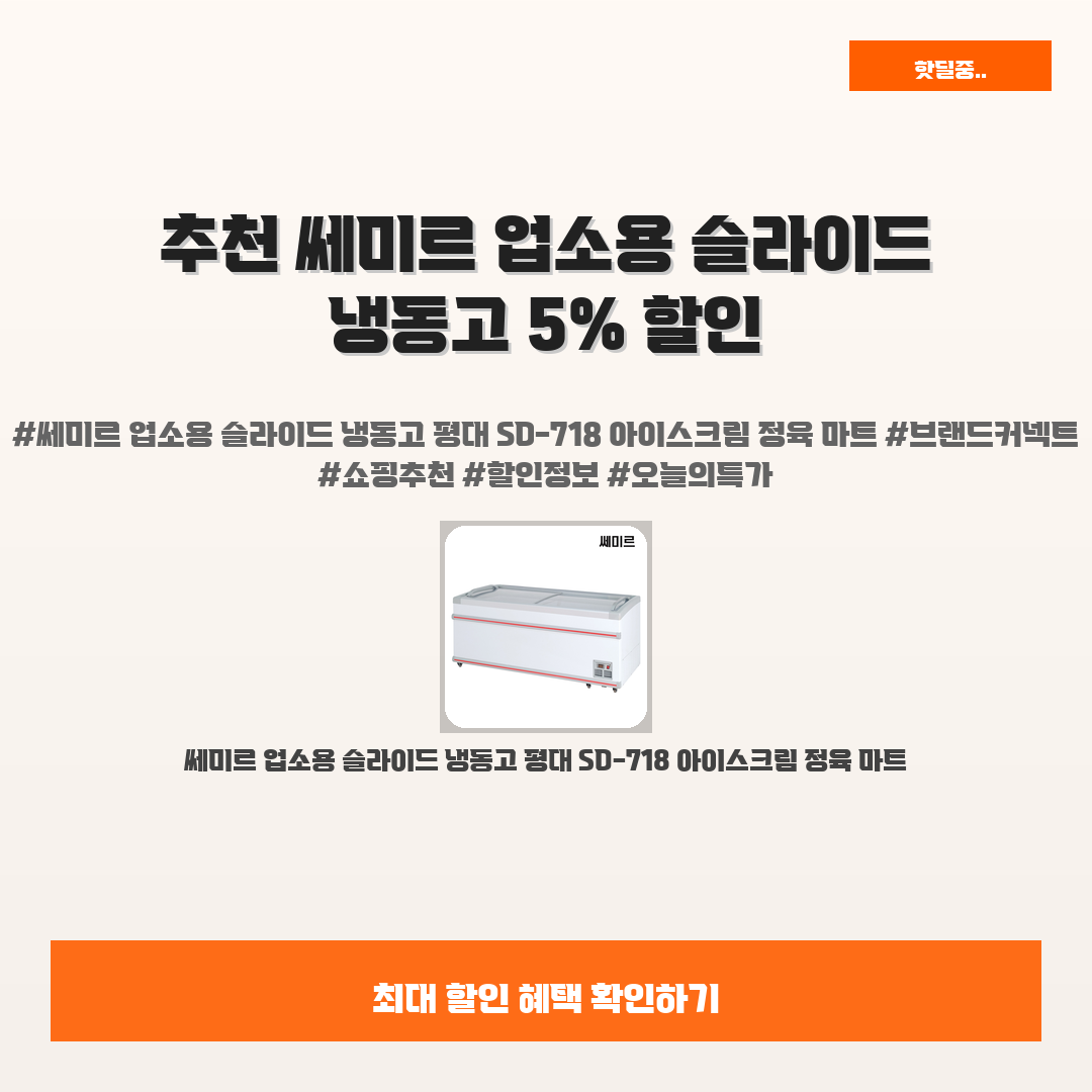 🛍️ 이 포스팅은 네이버 쇼핑 커넥트 활동의 일환으로,판매 발생 시 수수료를 제공받습니다.오늘 소개할 제품은 바로,,쎄미르 업소용 슬라이드 냉동고 평대 SD-718! 아이스크림과 정육 마트에 딱 맞는 완벽한 필수템이에요.최근 아이스크림과 정육 상품을 보다 효율적으로 보관하고 싶으신가요?저렴한 가격과 뛰어난 성능을 가진 쎄미르 슬라이드 냉동고 SD-718가 해결책이 되어줄 거예요!높은 성능과 5% 할인으로 가격까지 합리적인 이 냉동고는 여러분의 비즈니스에 큰 도움이 될 거예요. 고객님들의 만족도 높은 선택, 지금 만나보세요!쎄미르 업소용 슬라이드 냉동고 평대 SD-718 아이스크림 정육 마트5% 1,963,000원1,859,000원포쿨 지금 구매하기 → ⭐ 쎄미르 업소용 슬라이드 냉동고 평대 SD-718..